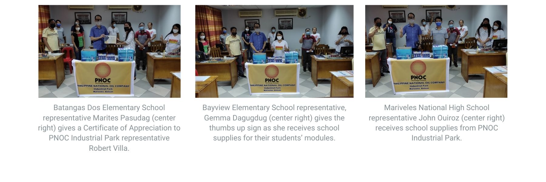 As part of PNOC’s Corporate Social Responsibility (CSR), the PNOC Industrial Park (PIP) donated paper and printer ink to three schools in Barangay Batangas Dos, namely, Batangas Dos Elementary School, Bayview Elementary School, and Mariveles National High School.